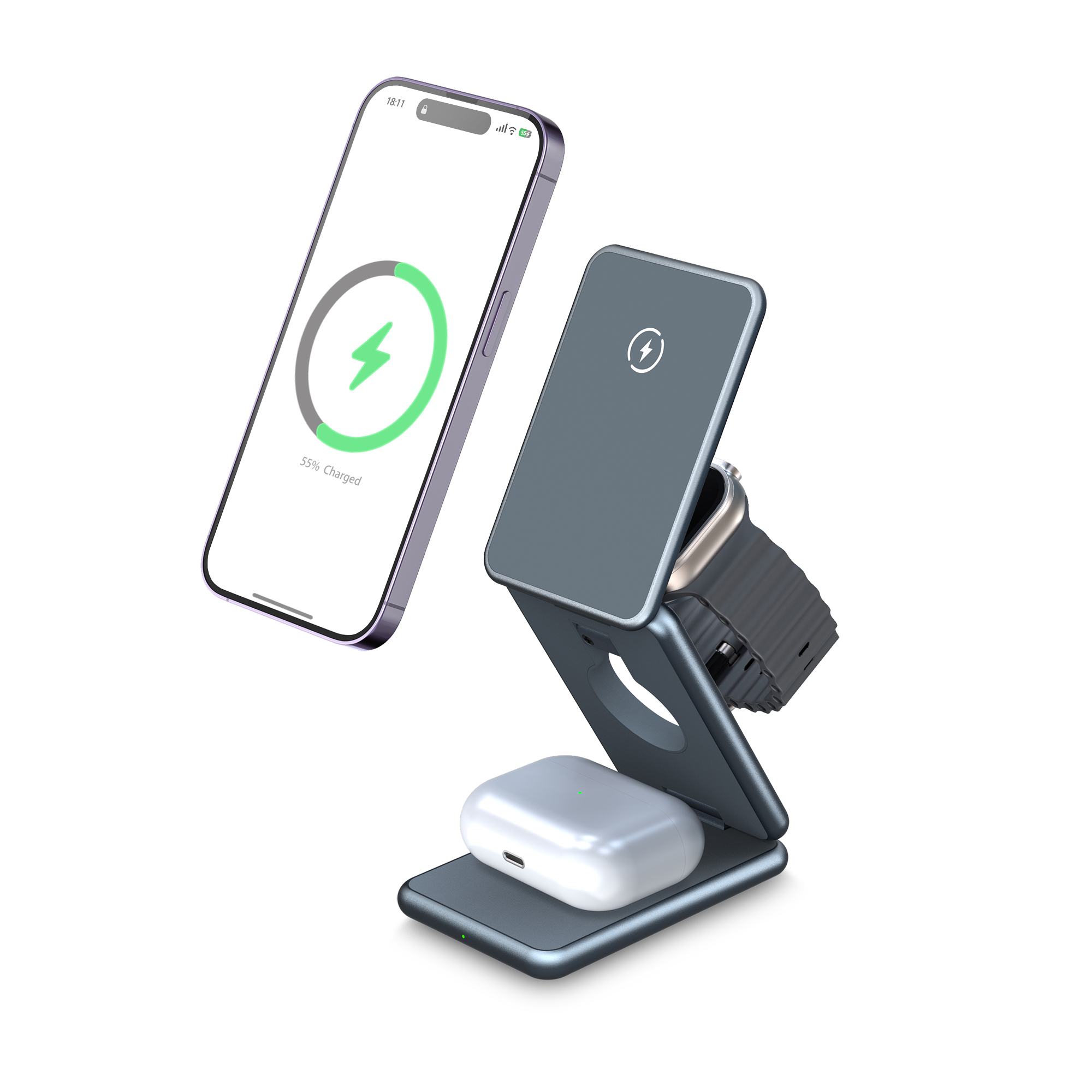 Streamline your charging routine with a single, multifunctional device. This 3-in-1 charger allows you to power your phone, wireless earbuds, and smartwatch simultaneously, reducing clutter and keeping your essentials fully charged in one place.